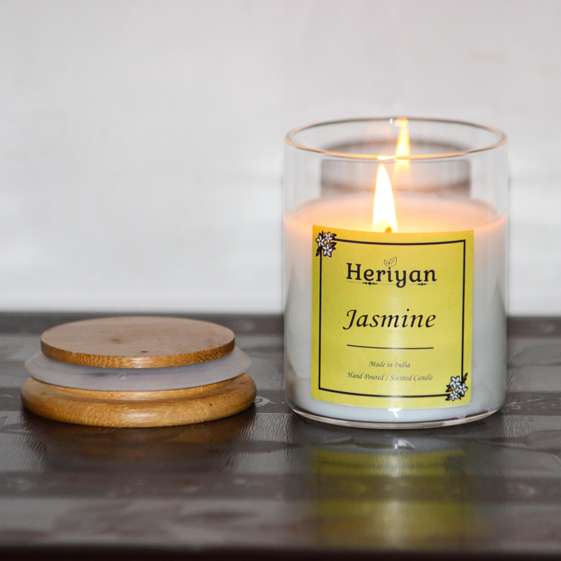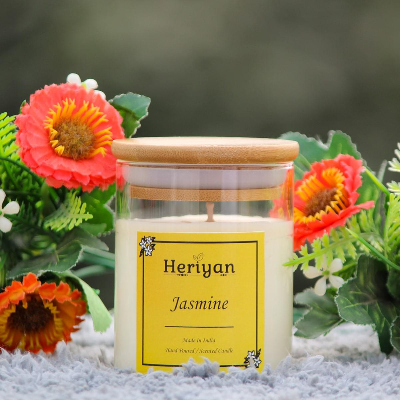 Heriyan Scented Candles | Highly Fragranced Glass jar with Wooden Lid | Up to 40 Hrs Burning Time (Jasmin)